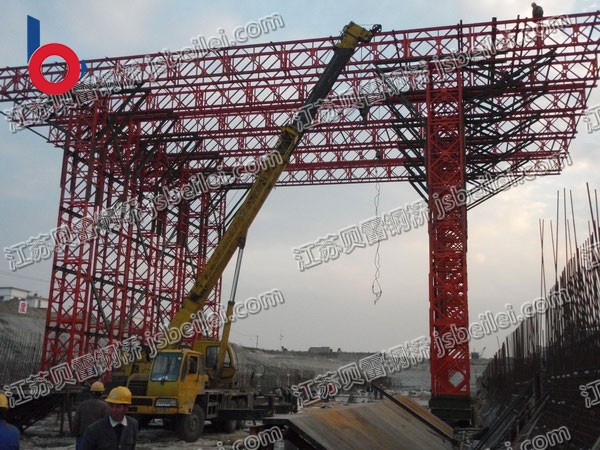 接下來就是吊裝施工流程了。在施工時根據(jù)場地實際情況,貝雷片吊裝場地選在鋁廠專用線夾角地。為了安全起見,每三組吊裝一次,吊裝前應將貝雷片各桿件連接完畢。貝雷梁的支撐連接常用斜撐、支撐架、抗風拉桿、橫梁夾具、桁架螺栓、弦桿螺栓、斜撐螺栓、撐架螺栓等多種構件,這些材料要提前準備好。吊裝前應在兩側工字鋼上放出每組貝雷梁的準確位置,人工輔助吊車準確就位。貝雷梁放置在橫向分配梁上,采用U型扣與橫向分配梁連接。